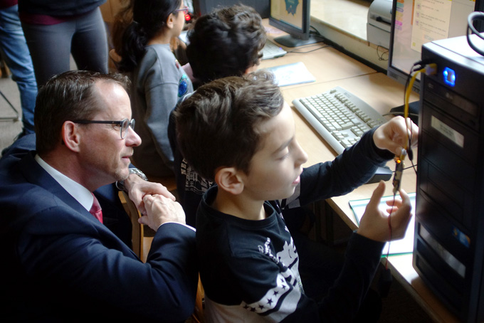 Projekt-Vorstandsmitglied Bernhard Grohe lässt sich die Funktion des Calliope Mini erläutern (Foto: Morkowsky)