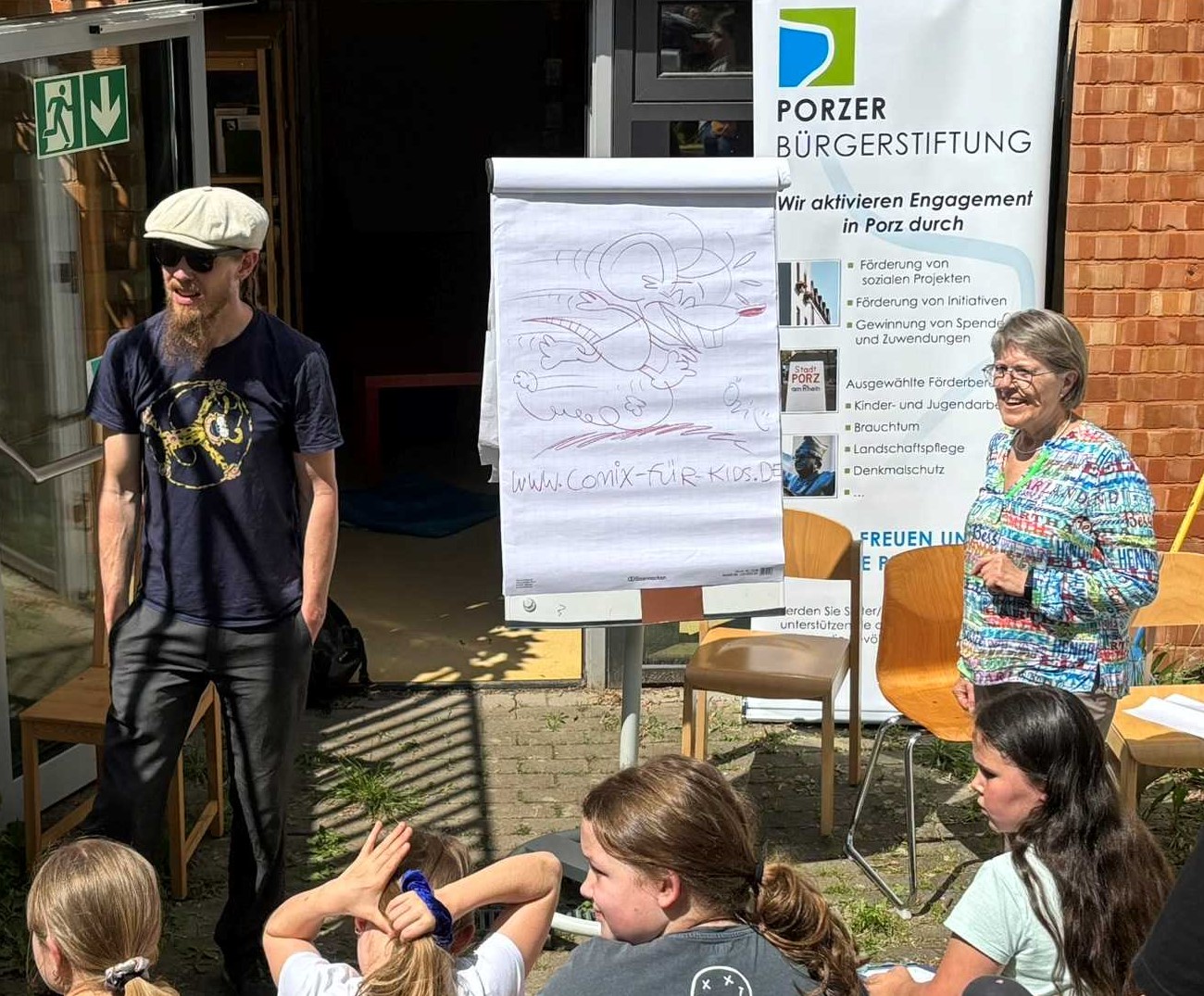 Erstmals wurden Klimaführerscheine an Porzer Grundschulen verteilt - Porzja&Jo-Erfinder Sebastian „Özi“ Jenal ist mit dabei